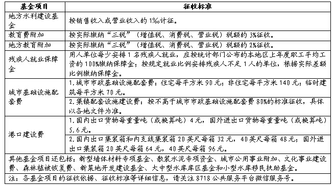 答:我市目前征收的政府性基金共14种,其中涉及工业企业较多的基金项目和征收标准摘要如下表:
