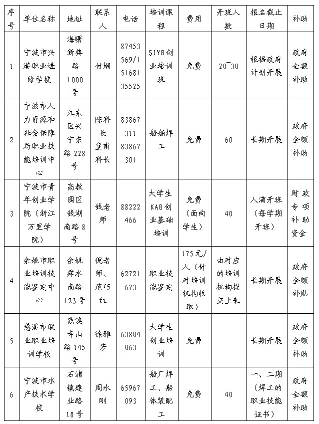 答:职业技能政府补助定点培训机构数量较多,以下仅部分定点培训机构,更多请关注宁波8718中小企业公共服务平台微信服务号,同时可以在市人社局网站主页的“便民信息”—“职业技能政府补助定点培训机构”查询。