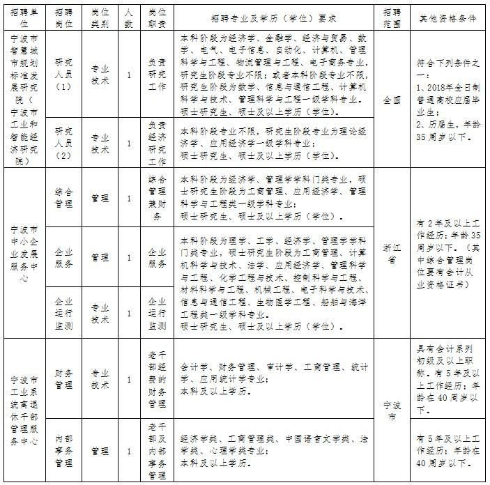 根据《宁波市事业单位公开招聘工作人员实施办法》,经市人力资源和社会保障局同意,市经信委直属事业单位宁波市智慧城市规划标准发展研究院(宁波市工业和智能经济研究院)、宁波市中小企业发展服务中心、宁波市工业系统离退休干部管理服务中心决定面向社会公开招聘事业编制工作人员7名。现就有关事项公告如下: