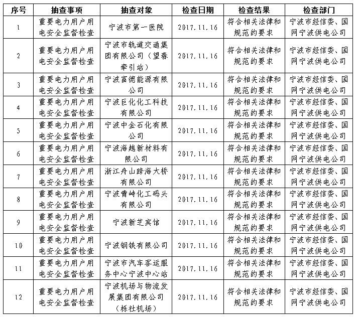 2017年11月16日,我委会同国网宁波供电公司对12家企业进行了电力监管“双随机”监督抽查,检查重要电力用户用电安全。经检查,12家企业用电安全符合相关法律和规范的要求,不存在违规现象。现将有关结果予以公告。