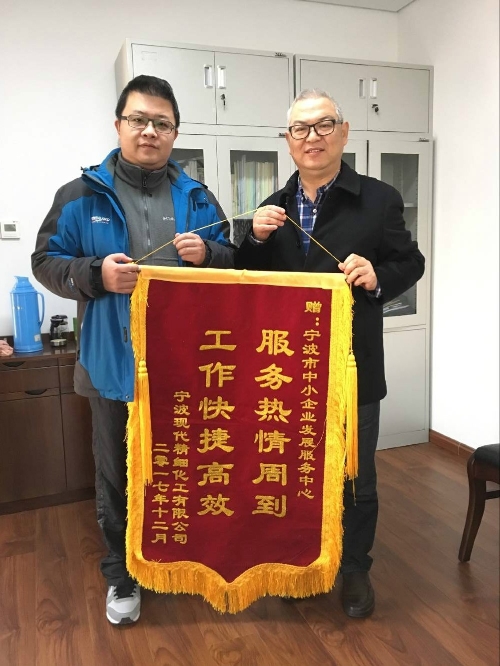 12月18日一早,宁波现代精细化工有限公司总经理一行来到市中小企业发展服务中心,送上锦旗,对市中小企业发展服务中心在企业服务中热情周到、快捷高效,积极帮助企业解决难题并最终获得圆满结果的辛勤努力和优质服务表示感谢。