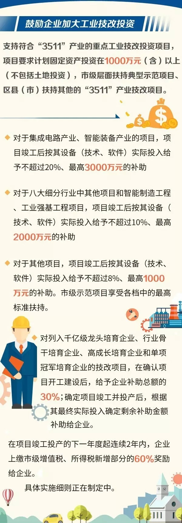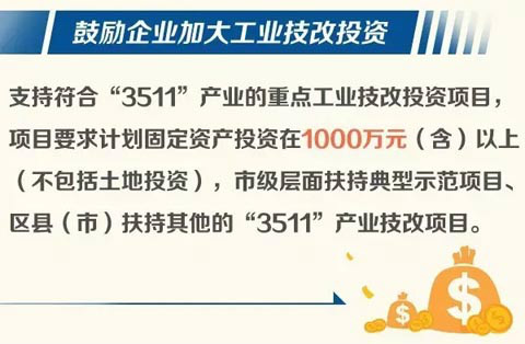 | 鼓励企业加大工业技改投资。对投资规模1000万元(含)以上的“3511”产业重点工业技改投资项目,在项目竣工投产后,按照实际投入给予分类分档奖补。其中:集成电路、智能装备产业项目按照实际投入投入给予不超过20%、最高3000万元的补助;八大细分行业中其他项目和智能制造工程,工业强基工程项目,按照实际投入给予不超过10%、最高2000万元的补助;其他项目按照实际投入给予不超过8%、最高1000万元的补助。对列入千亿级龙头培育企业、行业骨干培育企业、高成长培育企业和单项冠军培育企业的项目,按项目开工、竣工投产两个阶段,分别给予补助总额30%、70%的补助。在项目竣工投产的下一年度起2年内,按企业对地方财政实际贡献,给予市级新增部分60%,最高不超过1000万元的奖励。 |