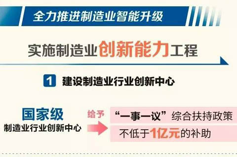 | 建设制造业行业创新中心。对列入国家级的制造业行业创新中心,给予“一事一议”综合扶持政策,并给予不低于1亿元的补助;对列入省级的制造业行业创新中心,参照省政策给予支持;对列入市级的制造业行业创新中心,按照项目实际投资额给予30%、最高3000万元的补助。创新中心的科技创新及产业化等项目优先列入市级科技专项扶持项目计划。 建设高水平制造业产业技术研究院。面向八大行业细分领域,支持骨干企业、高校院所牵头合作共建高水平产业技术研究院。对投资规模5000万元以上,其中仪器设备投入占60%以上、区县(市)已投入经费支持的,按其科研基建(不含土地购置)和研发仪器设备购置投入,市财政分别给予不超过20%和30%、最高3000万元的补助。对特别重大的产业技术研究院,按“一事一议”方式予以支持;对获评为国家重点实验室、国家工程技术研究中心的,给予最高3000万元的奖励;对获得各级企业技术中心、重点企业研究院(设计院)的,给予最高600万元的补助。 推进行业技术突破。加大对科技成果转化的支持力度,每年安排2亿元资金,实施市“创新2025”重大科技专项,重点支持智能芯片及基础软件、高档数控机床及工业机器人、智能信息设施及产品、海洋新材料、高端金属材料、先进碳材料、高端精细化工、关键基础零部件、新型磁性材料与器件、清洁能源装备、高性能诊疗设备、新能源汽车等12个重大科技专项,优先支持重大科技成果转化落地。按照分步实施、滚动支持的方式,启动实施一批重大科技研发与成果转化项目,对单个科技项目按其科技投入额给予不超过30%、最高1000万元的补助。 培育发展制造业领域专业化众创空间。按照市场化、专业化的原则,面向新材料、智能制造、生物医药等细分领域,每年重点支持2~3家投资规模在5000万元以上,且仪器设备投入原值在2000万元以上的专业化众创空间,按照其科研基础设施投入(不含土地购置)给予不超过30%、最高2000万的资金补助。 支持工业创新设计发展。大力培育工业创新设计龙头企业,鼓励企业集聚发展,打造具有影响力的工业创新设计基地(中心)。鼓励工业创新设计企业与制造业企业深度合作,支持引进培育基于互联网的众创众筹设计和中介服务机构,提升“和丰奖”工业设计大赛水平,推广工业创新设计产品。鼓励工业创新设计企业、个人积极参加知名工业设计竞赛、评奖等活动,并给予一定的补助和奖励。 |