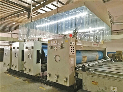 顺着通道向前,两边排列着多部台彩印机床,每台机床上方是一个大的透明塑料罩,塑料罩连通着管道,有点像巨型抽油烟机。毛奇峰介绍说,“这是挥发性气体集气罩,我们油墨是环保级的,但是彩印需要加热,可能会产生少量气味,通过设置集气罩统一收集,集中处理无味以后再排放。这项环保标准已经高于国外,国外没有采用集气设备。